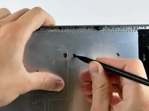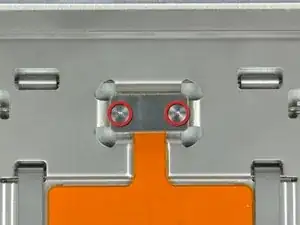 Снимите два винта Phillips, фиксирующие электронную кнопку трекпада к нижнему корпусу.