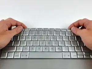 Немного выгните клавиатуру, чтобы освободить две защёлки возле верхнего угла с каждой стороны клавиатуры.