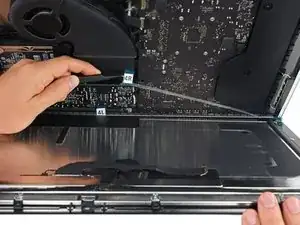 На данный момент хорошей идеей будет протестировать ваш ремонт, чтобы убедиться, что iMac работает правильно, прежде чем закрывать его. Выполните следующие три шага, чтобы временно подключить кабели дисплея и включить ваш iMac перед тем, как снять защитную пленку с клейких полос.