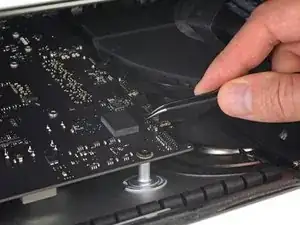 Проведите пальцем вдоль длины клеевой полосы, чтобы убедиться, что она прямая и без морщин, прижимая её по мере движения, чтобы приклеить полосу к iMac.