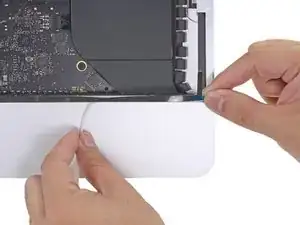 Проведите пальцем слева направо вдоль клейкой ленты, чтобы убедиться, что она ровная и без складок, прижимая её по ходу, чтобы приклеить ленту к iMac.