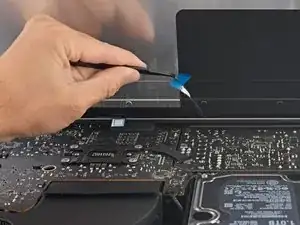 Снимите плёнку с двух нижних лент, зацепив сверху с помощью пинцета и потянув синие язычки вертикально вверх от нижнего края дисплея.