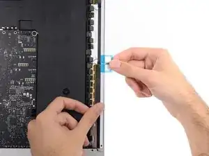 На этом этапе рекомендуется проверить ремонт, чтобы убедиться, что iMac работает правильно, прежде чем окончательно его закрывать. Выполните следующие три шага, чтобы временно подключить кабели дисплея и загрузить iMac до снятия защитной плёнки с клейких лент.