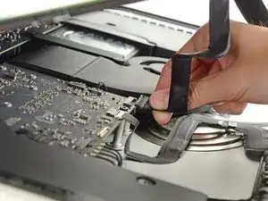Зафиксируйте металлическую прижимную скобу кабеля данных дисплея, опустив её к плате логики.