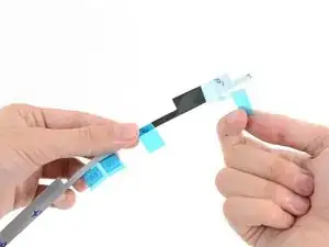 Держа лопатку, всё ещё проткнувшую отверстие в клеевой полоске, вставьте кончик лопатки в соответствующее отверстие в раме iMac.