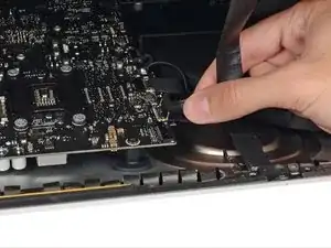 Закрепите металлическую скобу на кабеле данных дисплея вниз к материнской плате.