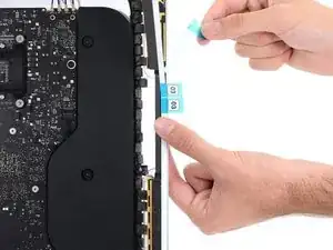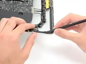 С помощью лопатки, всё еще находящейся в отверстии клеевой полоски, втисните кончик лопатки в соответствующее отверстие в раме iMac.