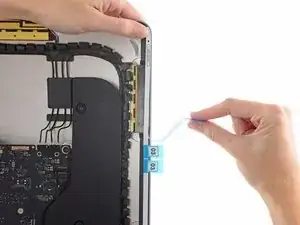 Зафиксируйте металлическую прижимную пластину кабеля данных дисплея, прижав её к логической плате.