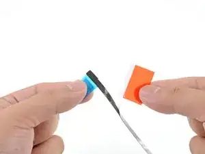 Схватите синюю язычок и снимите короткую часть защитной подложки с задней стороны полоски, чтобы оголить участок клея для приклеивания к корпусу.
