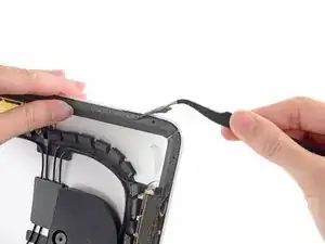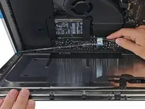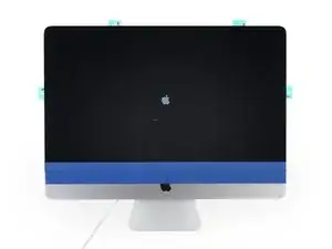 На этом этапе рекомендуется протестировать ремонт, чтобы убедиться, что iMac работает правильно, прежде чем окончательно его закрывать. Следующие три шага показывают, как временно подключить кабели дисплея и запустить iMac перед снятием защитной плёнки с клейких лент.