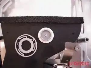 Существует три пластиковых штифта, которые выступают из задней панели, и кнопка устанавливается поверх них. Они выглядят немного расплавленными и сжатыми для удержания на месте. Я использовал карманный нож, чтобы приподнять и снять кнопку с штифтов.