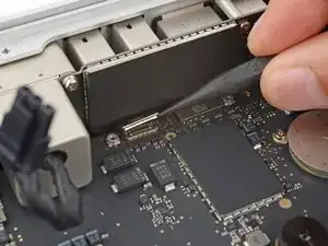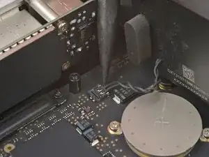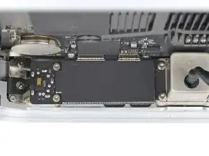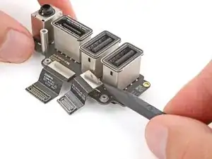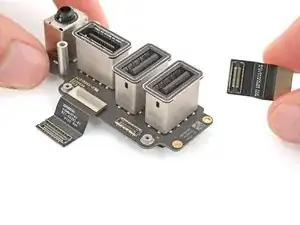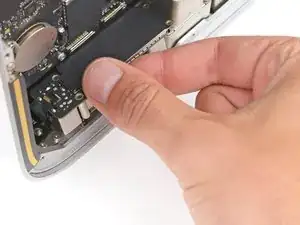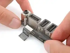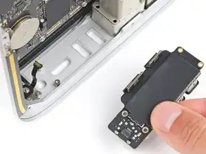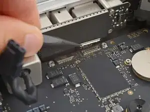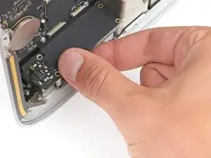 Используйте остриё лопатки или чистый ноготь, чтобы отогнуть запирающую планку шарнирного разъёма ZIF кабеля кнопки питания, расположенного на внешнем крае платы ввода/вывода.