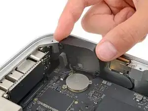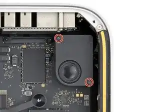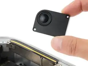 Используйте отвёртку Torx T5, чтобы выкрутить два винта длиной 12 мм, фиксирующие динамик.