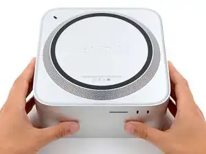 Переверните Mac Studio и положите его так, чтобы снизу была верхняя часть, а слот для SD‑карт и два передних порта USB‑C были повернуты к вам.
