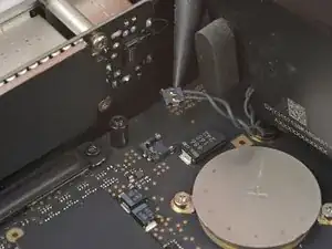 Поднимите внутренний край динамика и поставьте его вертикально, чтобы получить доступ к его разъёму на плате логики.