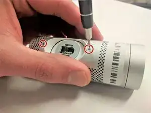 Удалите два винта длиной 3,55 мм, удерживающие корпус на шаровом соединении, используя отвертку PH000.