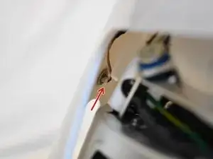 Поднимите корпус настолько, чтобы можно было просунуть руку через лючок доступа, и отсоедините кабель у кнопки питания.