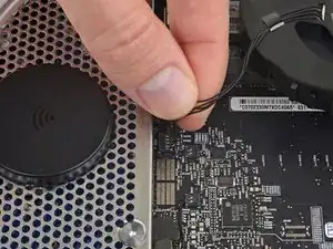 Выверните два винта T6 Torx длиной 11,3 мм, крепящие вентилятор к плате рядом с пластиной антенны.