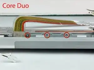 Если у вас машина с Core Duo, смотрите изображение 1 и снимите три винта с крестообразным шлицем, крепящие узел сцепления к нижнему краю передней рамки дисплея рядом с кабелем данных дисплея.