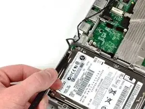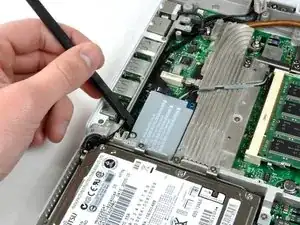 С помощью лопатки подденьте карту AirPort со стороны, ближе к жёсткому диску, чтобы отсоединить её разъём от платы.