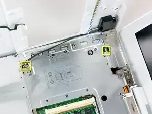 При сборке обратите внимание, чтобы винт возле левого шарнира прошёл через петлю кабеля данных дисплея, фиксируя кабель к верхней крышке.