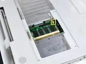 При сборке iBook убедитесь, что вы подключили кабель клавиатуры перед установкой экрана оперативной памяти на место.