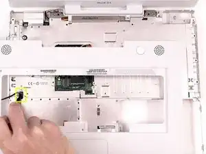 Отсутствует на этом фото Bluetooth-антенна, присутствующая в некоторых iBook. Она находится в верхнем правом углу отсека батареи, сразу над 4 мм винтом. На фото видна скоба для антенны — два отверстия в форме буквы I прямо над 4 мм винтом, которые нужно удалить на этом шаге. Чтобы снять антенну, сдвиньте её в сторону ЖК-экрана и наклоните вертикально назад к себе.