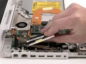 Из-за различий между моделями iBook G4 модем может выглядеть немного иначе, чем на фото. Все последующие шаги применимы к любому варианту.