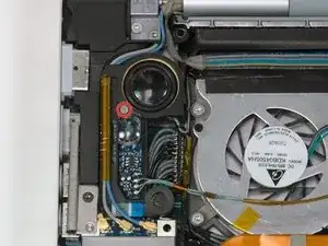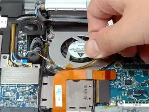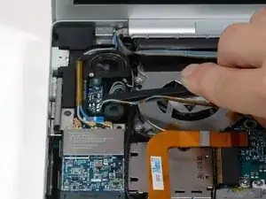 Оторвите кабель левого датчика окружающего освещения от верхней поверхности левого вентилятора, при необходимости удаляя клейкую ленту.