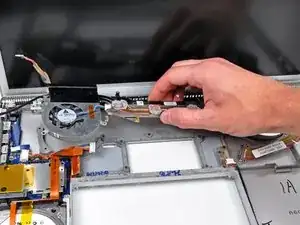 Поднимите и слегка поверните узел левого динамика. Полностью снять динамик пока нельзя, он все ещё подключен к левой плате ввода/вывода под ним.