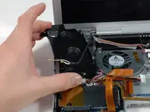 Одной рукой отведите назад кабель динамика и другой рукой поднимите оптический привод и выньте его из компьютера.