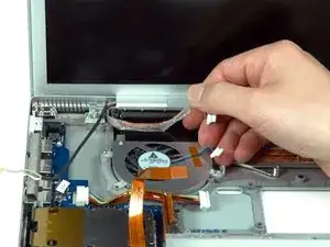 Отклейте кабели iSight и инвертора, которые прикреплены лёгким клеем над левым вентилятором.