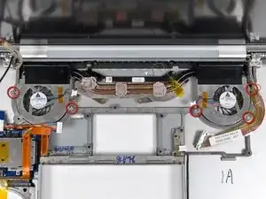 Удалите пять винтов T6 Torx длиной 7.8 мм, фиксирующих вентиляторы к нижнему корпусу.