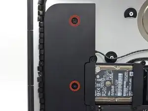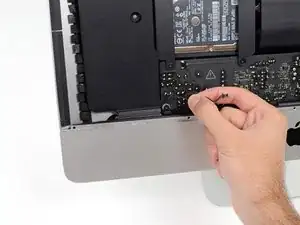 Возможно, потребуется отклеить полоску клея, расположенного вдоль нижнего края корпуса iMac, чтобы получить доступ к винтам.