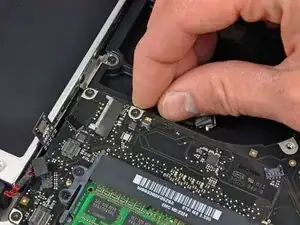 Удалите два 5 мм винта с крестовой шлицем, фиксирующих левый динамик к узлу платы логики.