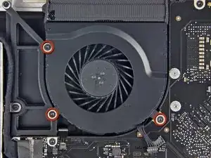 Удалите три одинаковых винта Torx T6, фиксирующих вентилятор в верхней части корпуса.