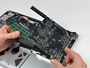 Осторожно приподнимите узел платы логики с левой стороны и выведите его из верхней части корпуса, следя за боковой панелью с разъёмами, которая может застрять при извлечении.