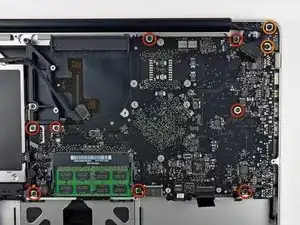 Восемь 3,5 мм винтов T6 Torx, фиксирующих плату логики к верхней части корпуса.