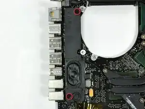 Удалите два винта Phillips 5 мм, фиксирующих левый динамик к плате логики.