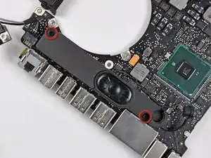 Снимите два коротких крестовых винта Phillips, фиксирующие небольшую экранирующую пластину EMI на логической плате.