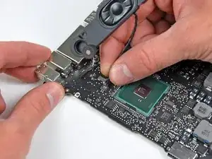 Снимите три винта T6 Torx 3,4 мм, крепящие левый вентилятор к логической плате.