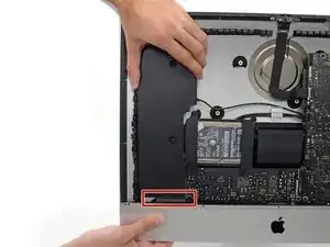 Возможно, потребуется отогнуть клей дисплея, расположенный по нижнему краю корпуса iMac, чтобы получить доступ к винтам.