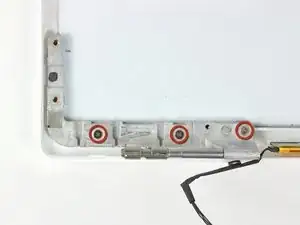 Удалите три винта Phillips 3,2 мм, фиксирующие левый шарнир хлястика к задней окантовке дисплея.