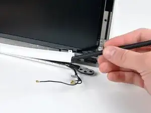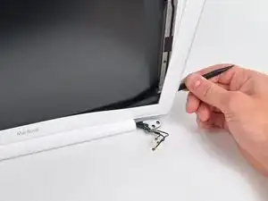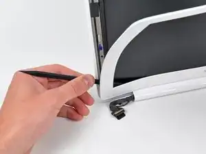 Вставьте плоский конец лопаточки в открытый край крышки шарнира и отожмите, чтобы освободить её от задней рамки дисплея.