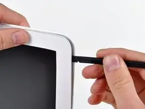 Вставьте плоский конец монтажной лопатки между тонкой резиновой полоской, окружающей переднюю рамку дисплея, и задней рамкой дисплея.