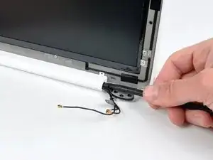 Удалите один 3 мм винт с крестообразным шлицем, крепящий заземляющую ленту антенны AirPort/Bluetooth к заднему динамику.