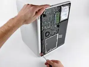 Удалите восемь 4 мм винтов с крестообразным шлицем (Phillips), крепящих нижнюю крышку к корпусу MacBook.