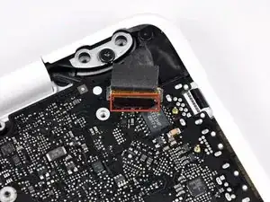 Используйте наконечник монтажной лопатки, чтобы поддеть коннекторы антенн AirPort и Bluetooth (всего 3) и отщёлкнуть их от платы AirPort/Bluetooth.