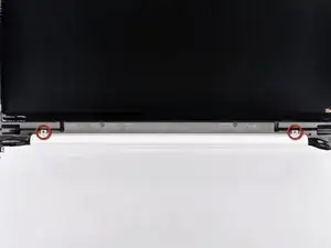 Удалите два винта Phillips 3 мм, фиксирующие крышку шарнира к задней рамке дисплея.