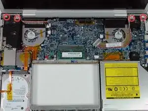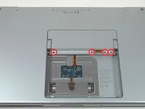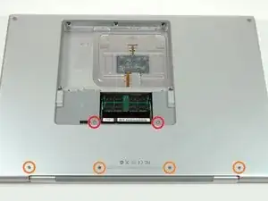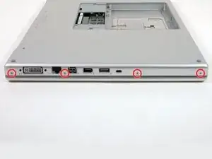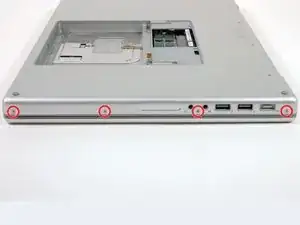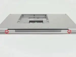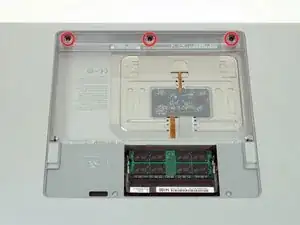 Удалите три винта Phillips в отсеке батареи возле защёлки. Apple предусмотрела небольшой наклон этих винтов, чтобы их было легче выкрутить. На модели A1261 головки этих винтов имеют диаметр 4 мм, а не 3 мм, как у винтов корпуса.